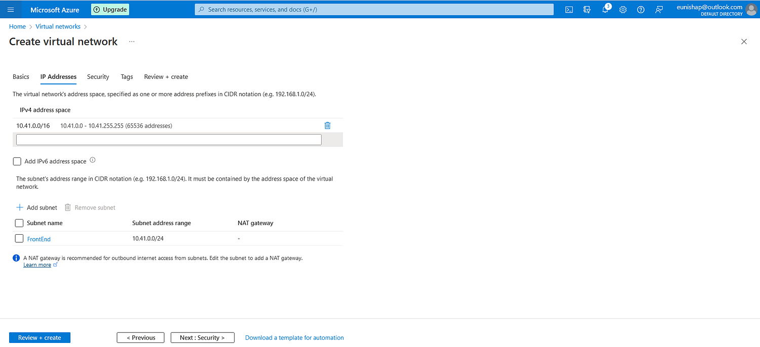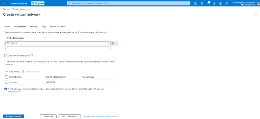 Next, I configured the IP addressing for the network, assigning it a network address space and a FrontEnd subnet from this space.
