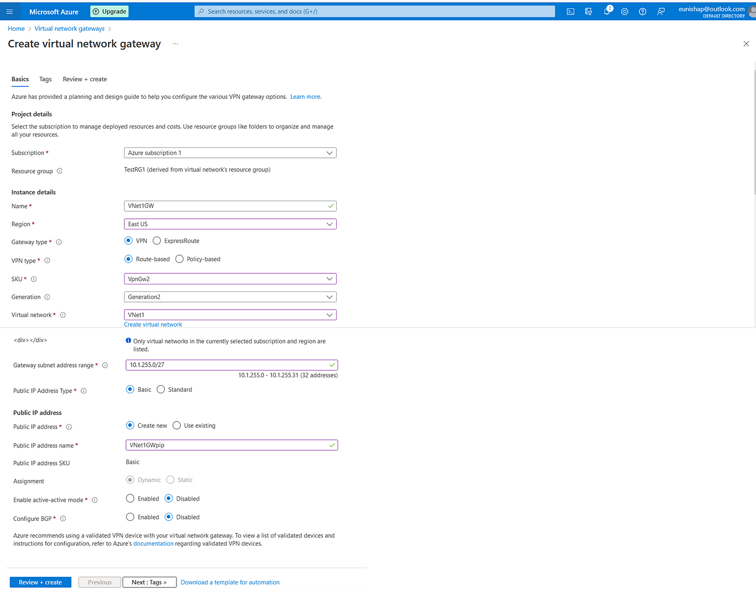 With VNet1 in place, I deployed a VPN Gateway to a dedicated GatewaySubnet. Microsoft recommends using a CIDR /27 block for future scalability. This gateway is of type VPN and Route-Based. I did not enable any HA or BGP options.
