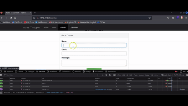 On the Acme IT Support website, navigate to the contact page. Each time the page loads, you might observe a quick red flash on the screen. We will use the Debugger to investigate this red flash and determine if it contains any interesting information. Although debugging a red dot is not a typical task for a penetration tester, it helps us familiarize ourselves with the Debugger's functionality.