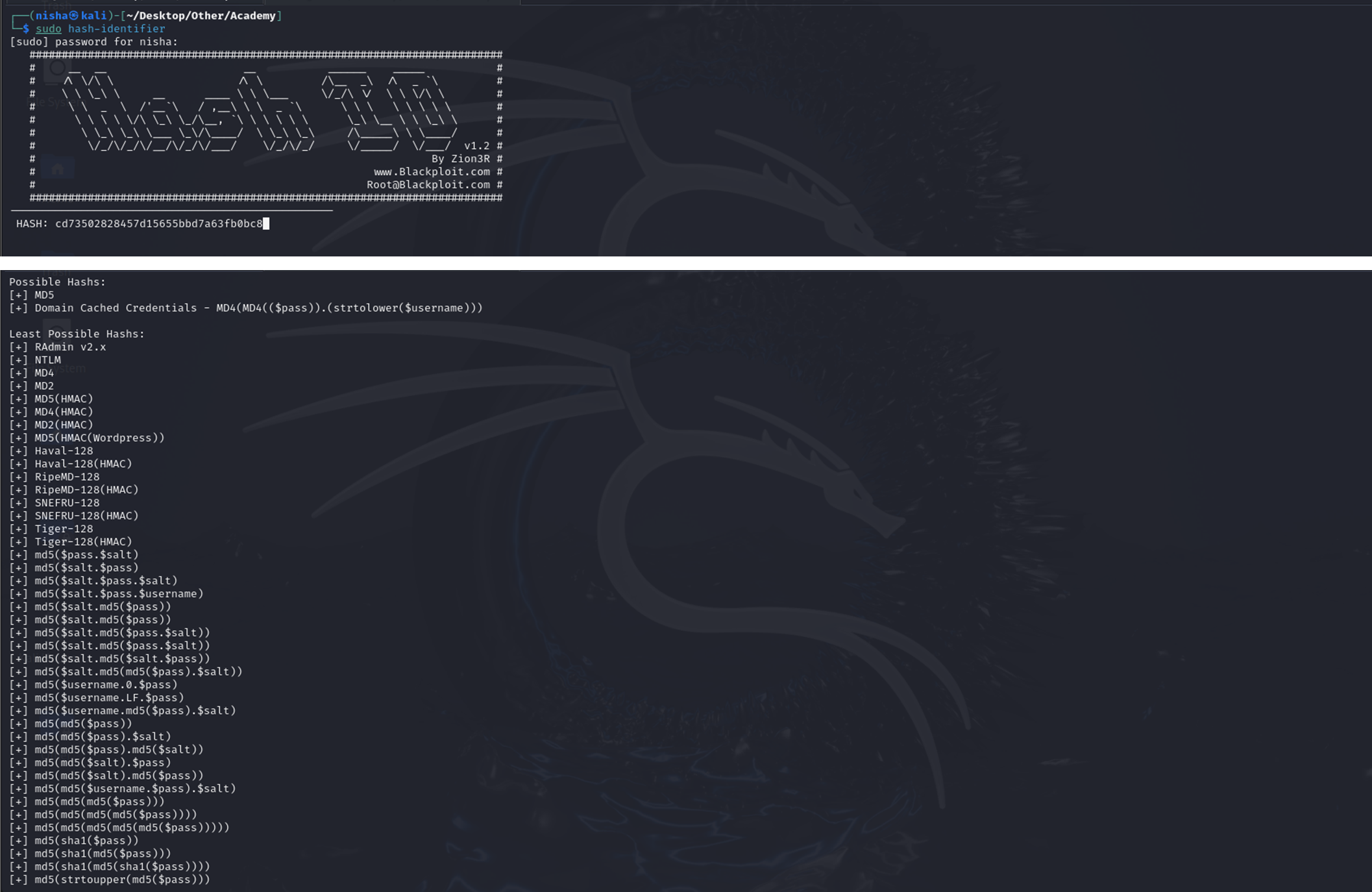 To identify the hash type, I used the hash-identifier tool on Kali Linux, which identified it as an md5 type hash: