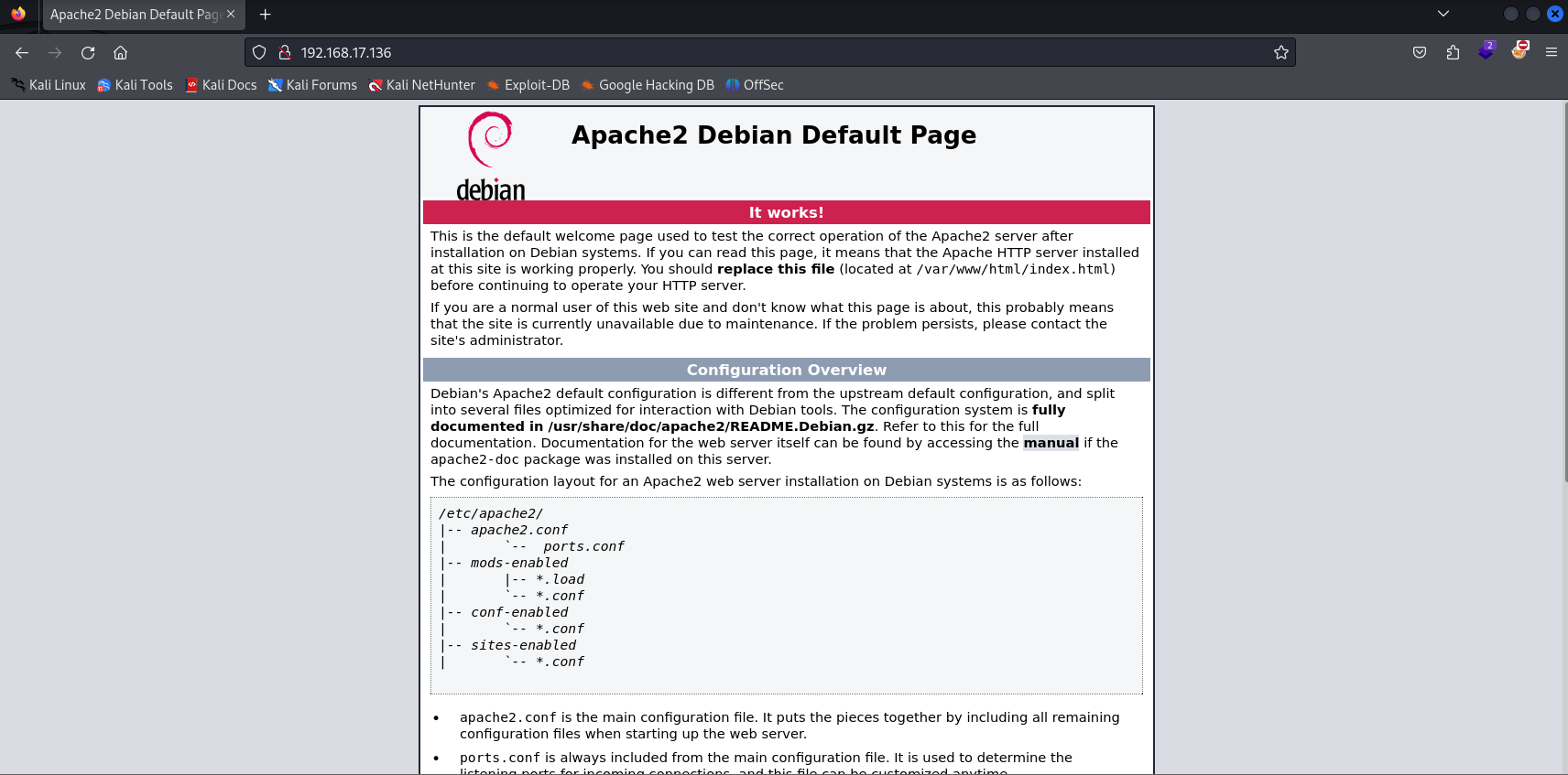 With the information gathered from the FTP service, I turned my attention to the web server running on port 80. I opened the browser and navigated to the target IP address. The Apache default page appeared, indicating that the server was running Apache and no custom web page had been configured yet.
