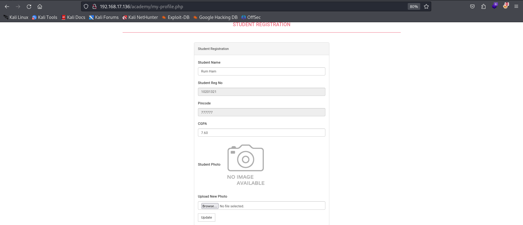 After successfully logging into the target system, I explored the available options within the online course registration page. The “My Profile” page at http://192.168.17.136/academy/my-profile.php contained a photo upload form:
