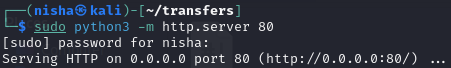 Next, I created a transfer folder on my Kali machine to store the LINPEAS script. I spun up a web server within this directory to serve files that can be downloaded by other machines.