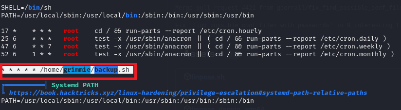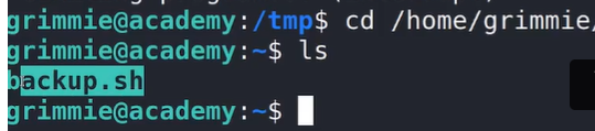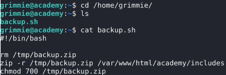 The LINPEAS output had already pointed out the backup.sh script, so I decided to investigate it further. I navigated to the /home/grimmie directory. In this directory, I found the backup.sh script and examined its contents: