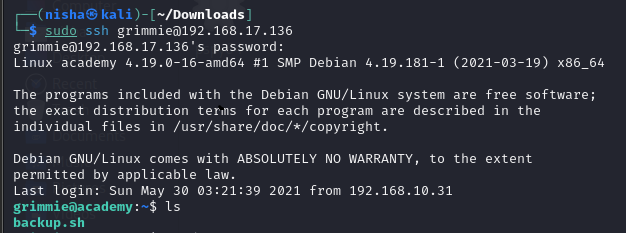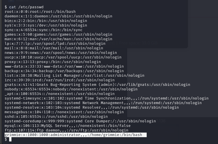 Using the discovered credentials, I was able to SSH connect to the target using the grimmie user account: