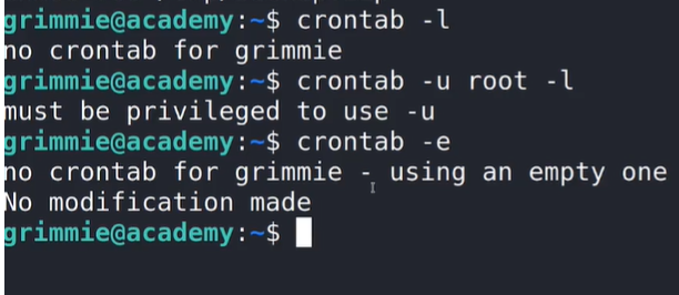 The output here indicates that there are no cron jobs scheduled for grimmie or the root user.