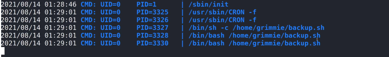 Pspy is pretty neat! It gave me output of all the processes that are running on the machine. Looking at the provided output, I found that the backup.sh script was indeed running. This confirmed that the script was scheduled to execute periodically. We were able to observe how often it was running—every minute.