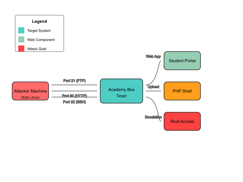 This box simulates a vulnerable educational institution’s network infrastructure, specifically targeting their student registration system. The environment represents a common scenario where seemingly minor misconfigurations can lead to full system compromise.