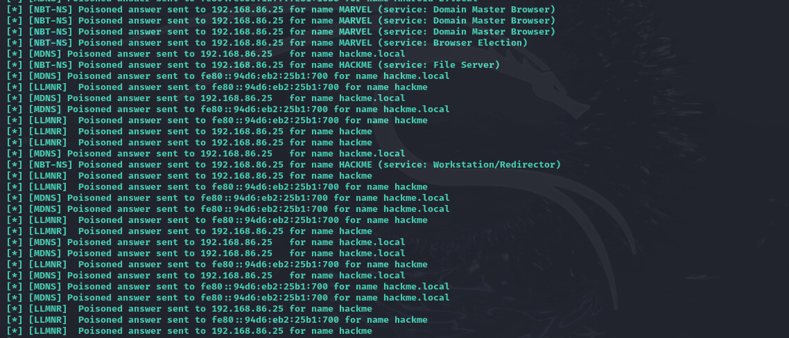 - The attacker runs Responder to listen for and capture SMB authentication requests from network hosts.