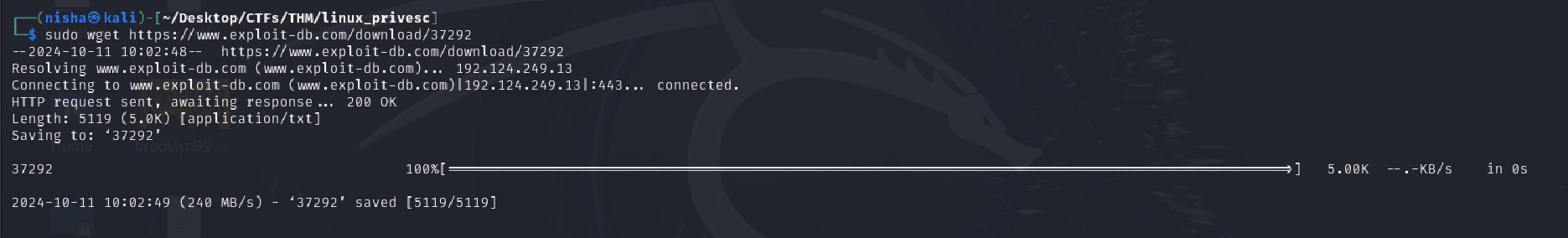 On the target VM, I navigated to the /tmp directory since it is typically world-writable. Then, I downloaded the exploit from my Kali machine’s Python web server: