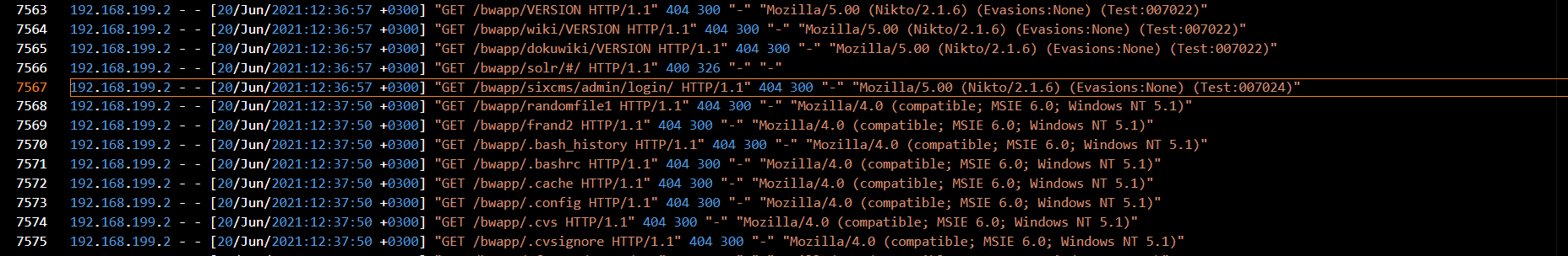 At line 30, I found Nikto in the User-Agent string, confirming that the attacker used Nikto, a popular web vulnerability scanning tool.