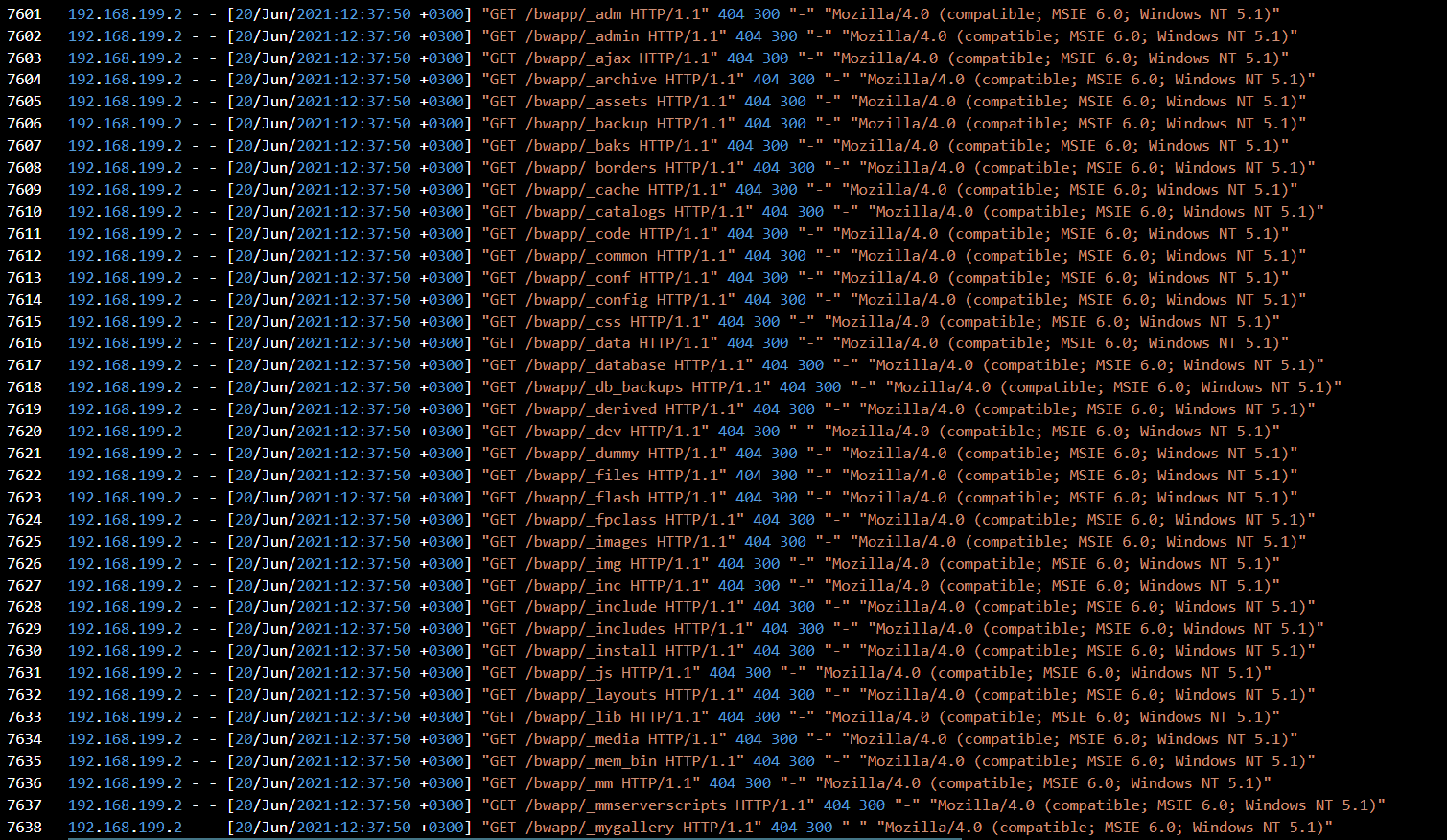 Reviewing the subsequent requests, I noticed the attacker was attempting to enumerate directory paths in alphabetical order, many of which returned 404 Not Found responses. This pattern is consistent with directory brute forcing.