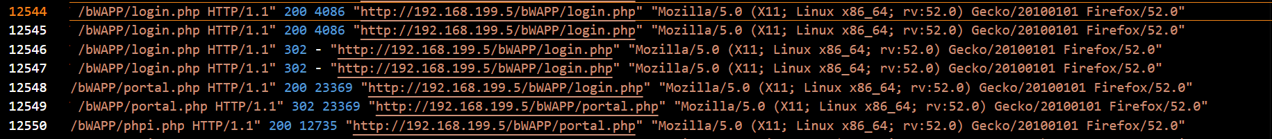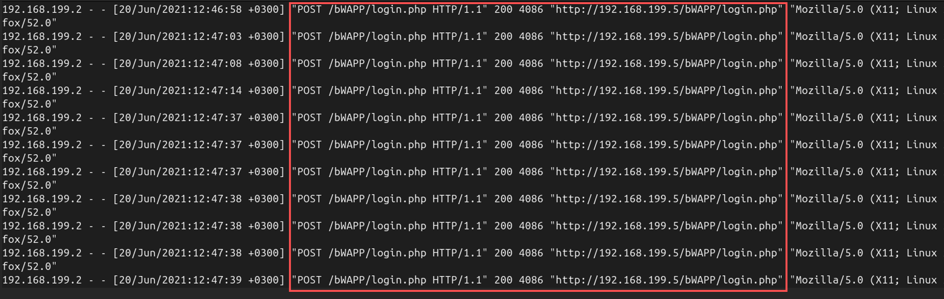 After directory brute force, the attacker shifted to a brute-force login attack. Logs showed repeated POST requests to /bWAPP/login.php with the same User-Agent string, indicating attempts to guess credentials.