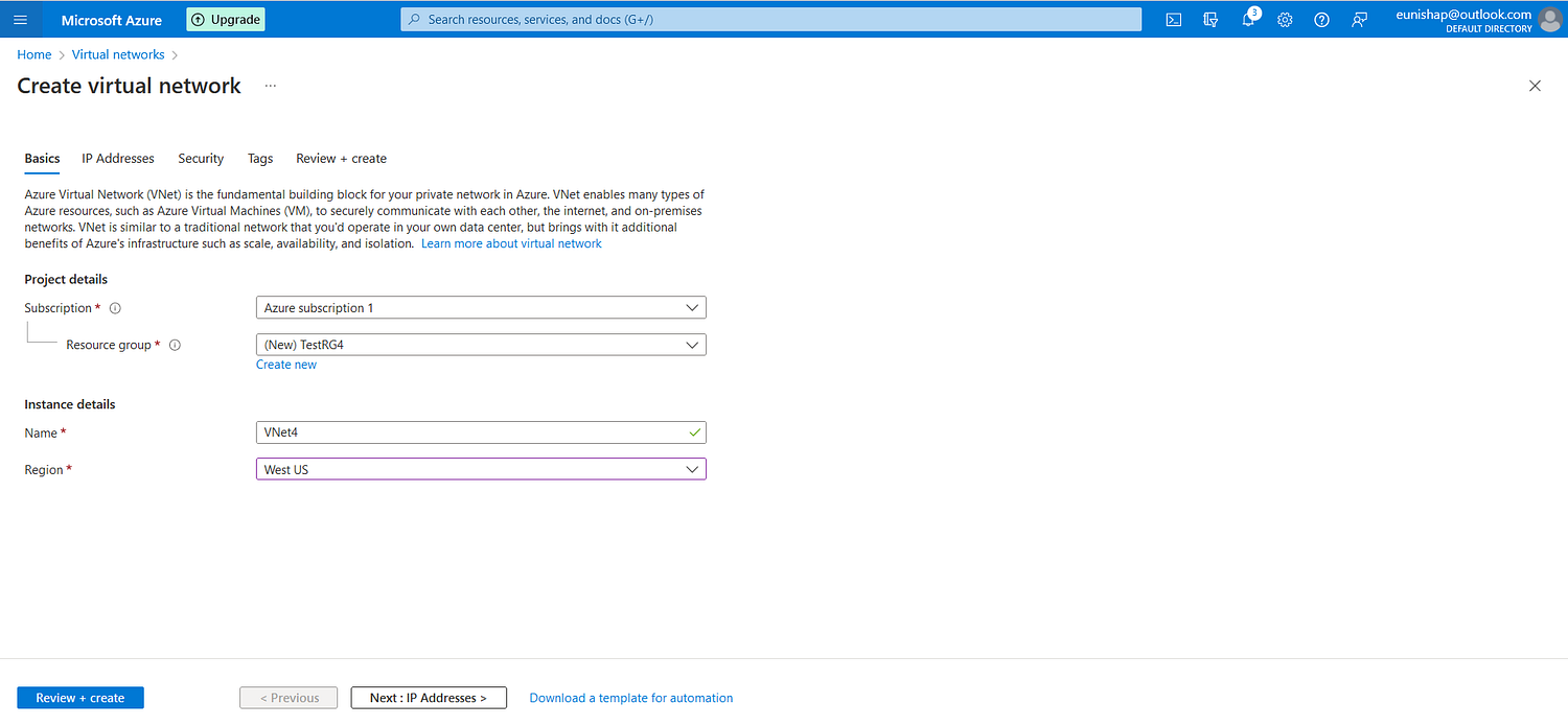 In the first step, I created the first virtual network, VNet1, in the TestRG1 Resource Group, located in the East US Azure Region.