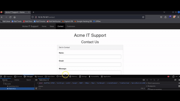 On the Acme IT Support website, navigate to the contact page. Each time the page loads, you might observe a quick red flash on the screen. We will use the Debugger to investigate this red flash and determine if it contains any interesting information. Although debugging a red dot is not a typical task for a penetration tester, it helps us familiarize ourselves with the Debugger's functionality.