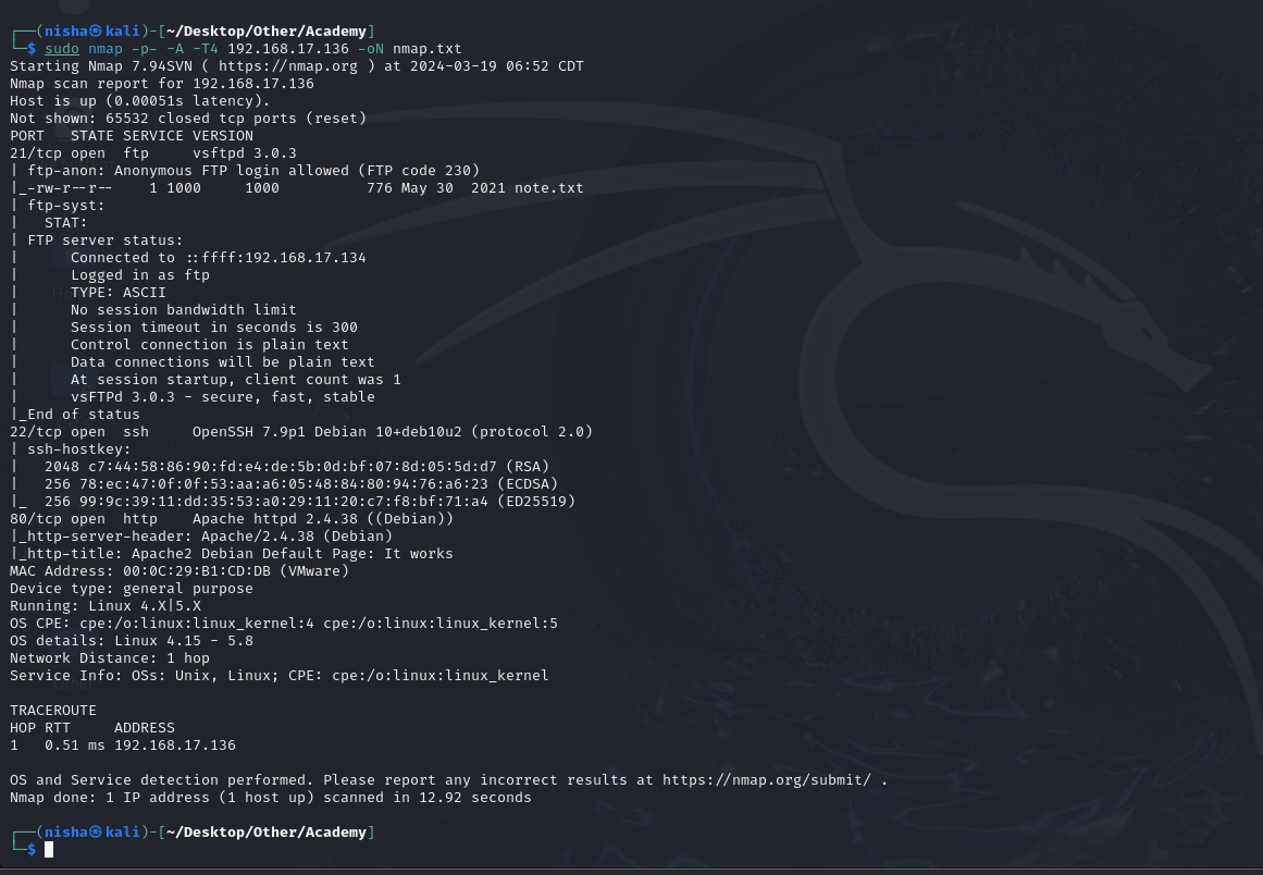nmap -p- -A -T4 192.168.17.136 -oN map.txt