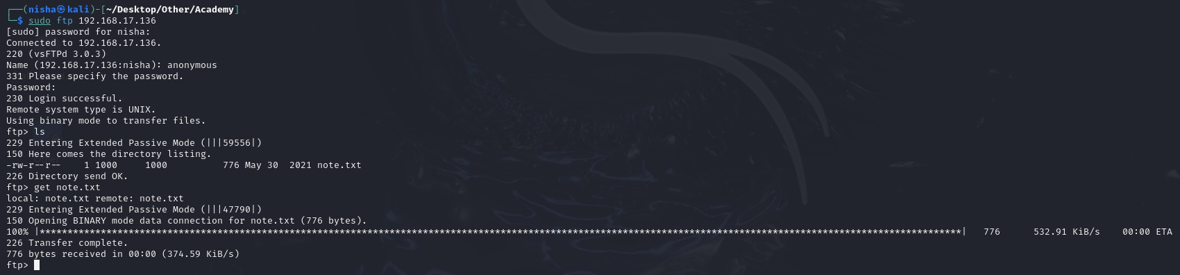 I began by connecting to the FTP server on the target machine. To do this, I used the ftp command, followed by the target IP address. I used anonymous login since this option was enabled on the server.