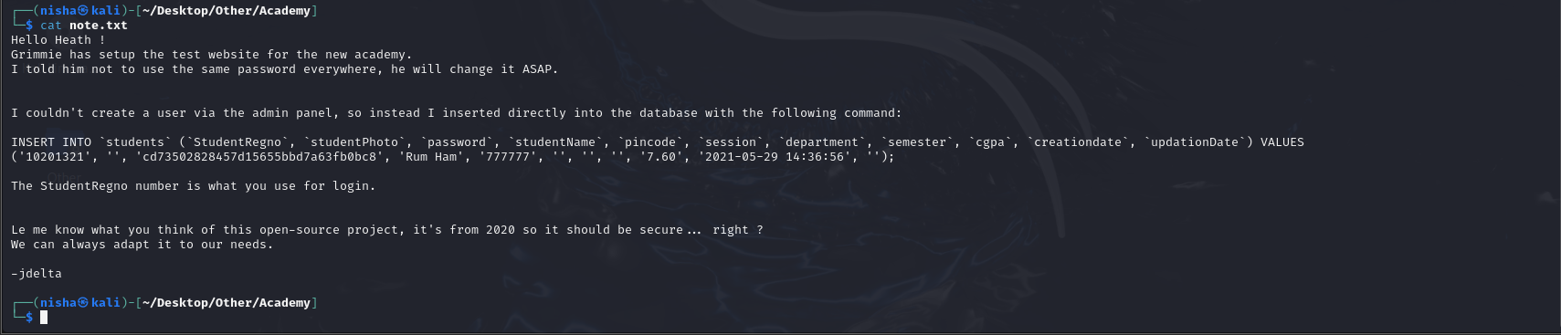 The note contained information about a student registration database, but more interestingly, it included a password hash. This hash seemed like it could be the key to accessing additional resources or gaining further control over the system.