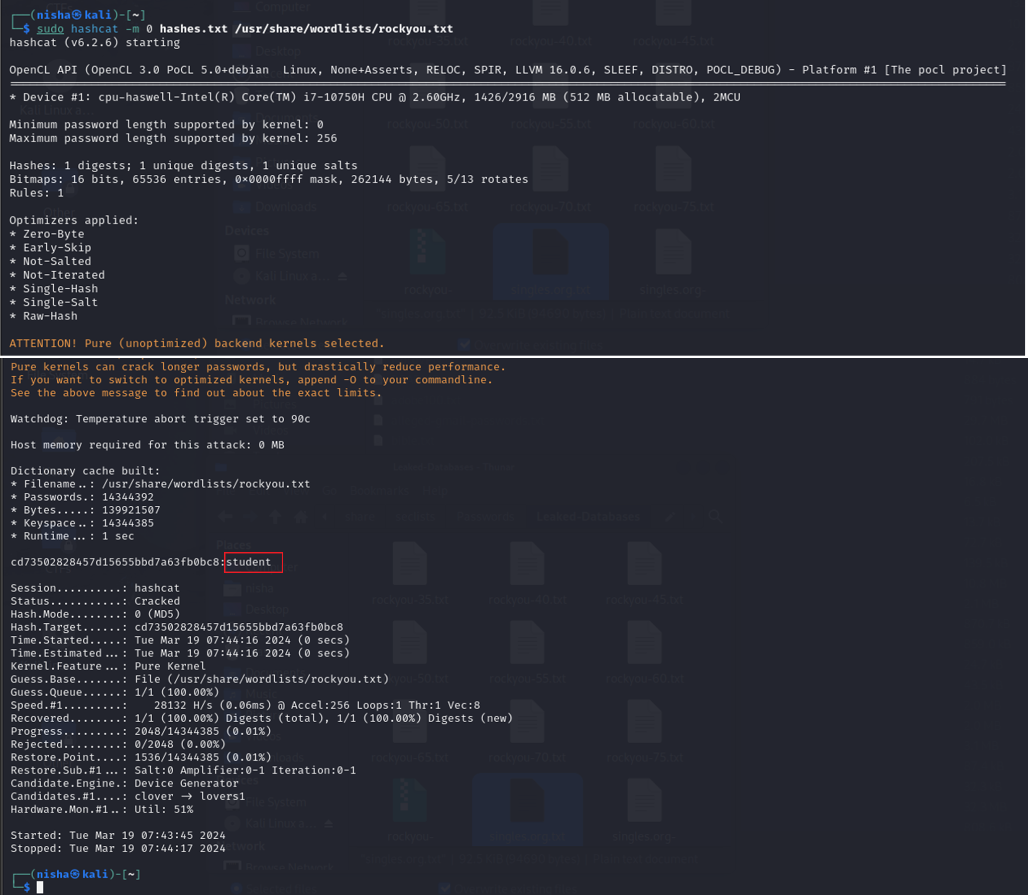 hashcat -m 0 hashes.txt /usr/share/wordlists/rockyou.txt