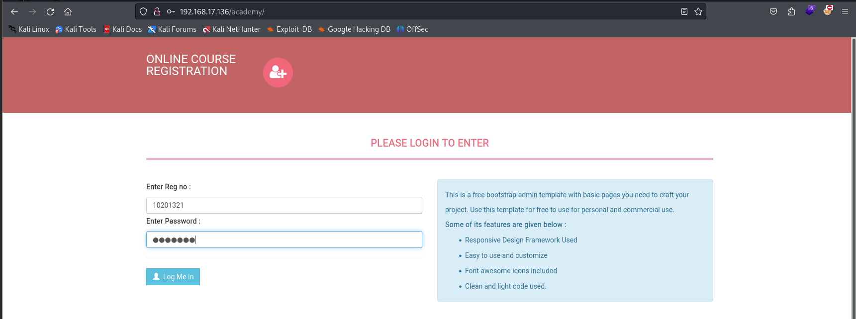 The results revealed 301 redirects for two interesting paths: /phpmyadmin and /academy. These redirects suggested that these directories were actively being used on the server and could lead to further vulnerabilities or misconfigurations. Upon visiting http://192.168.17.136/academy, I found a login form requesting a student registration number and password: