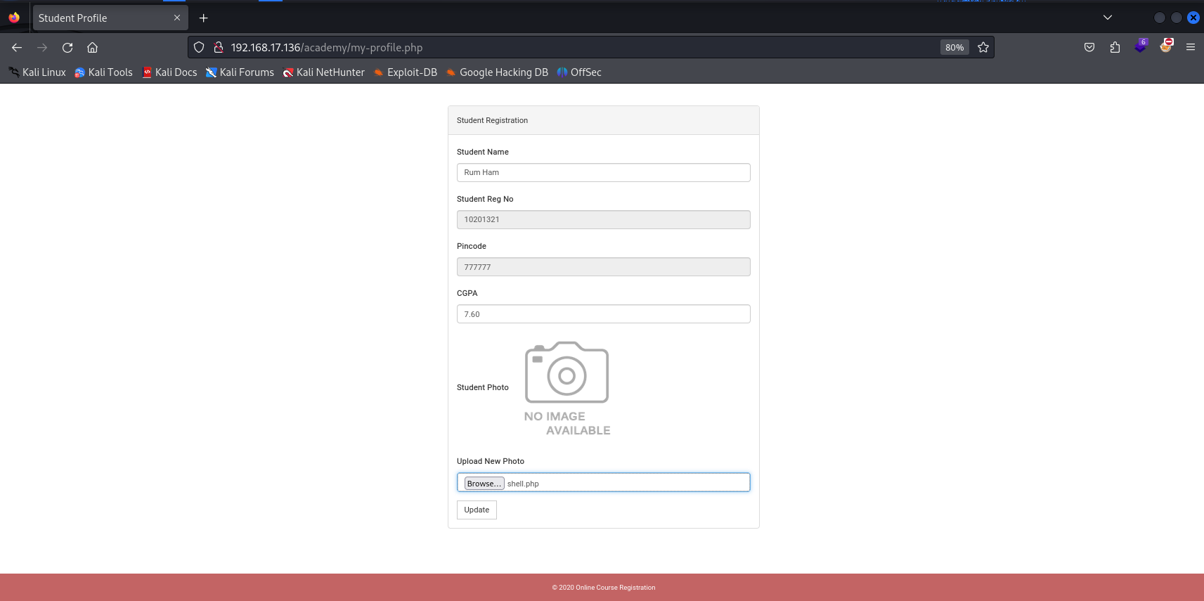 After successfully logging into the target system, I explored the available options within the online course registration page. The “My Profile” page at http://192.168.17.136/academy/my-profile.php contained a photo upload form: