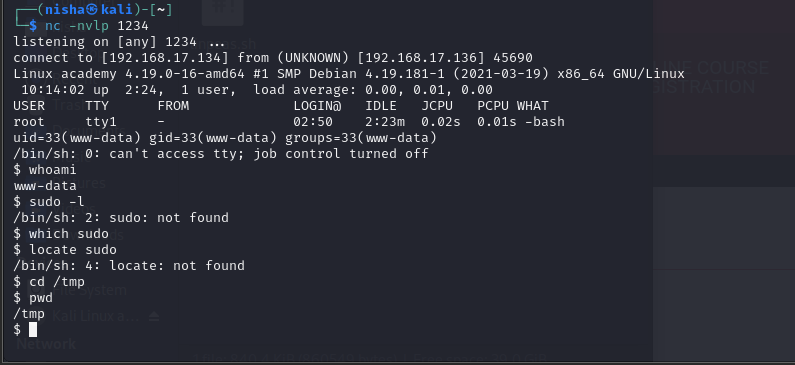 The shell immediately connected back to my Kali machine and I was logged in to the target using the www-data user account, which did not have any elevated privileges: