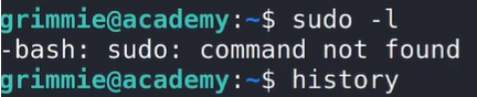 Since Grimmie didn’t have access to sudo, I decided to try the history command to see if there were any previously executed commands that might provide additional insights or opportunities for privilege escalation.