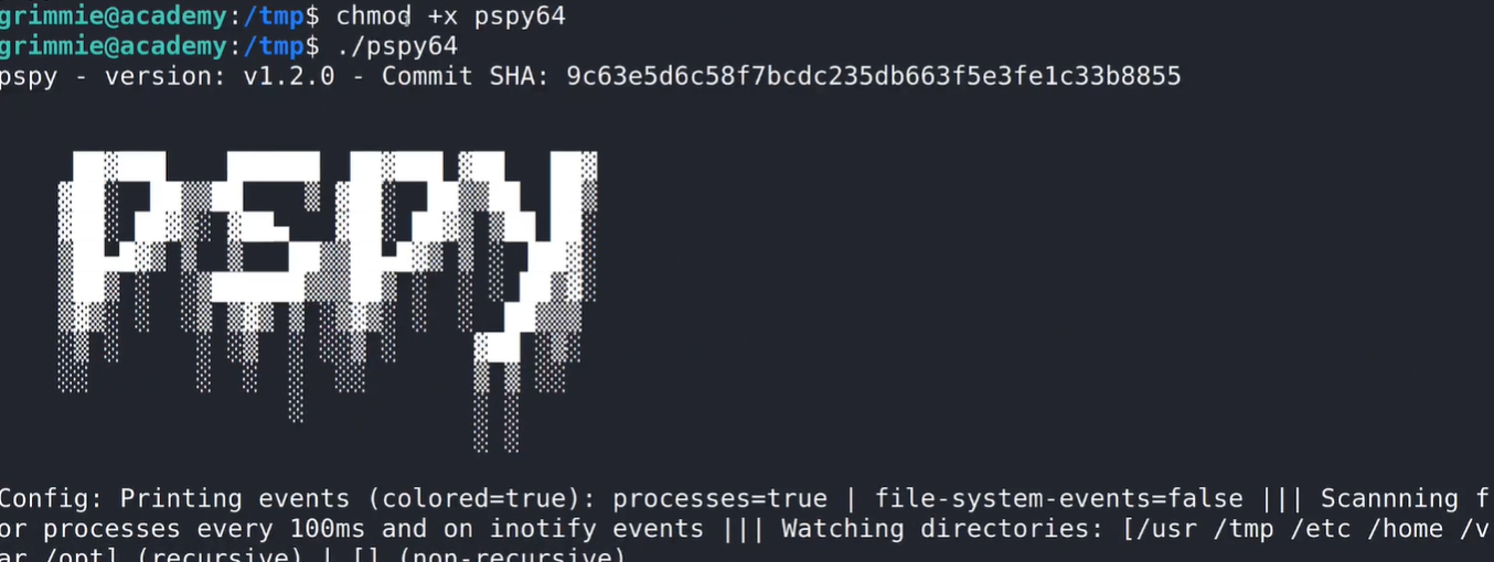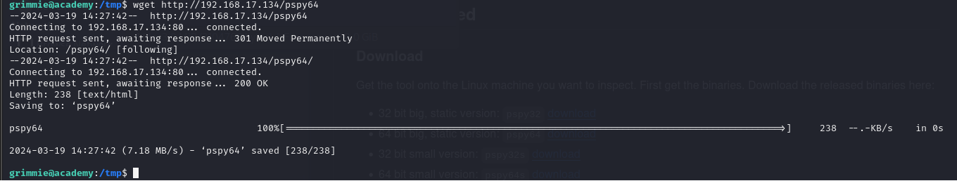 I downloaded pspy to my Kali machine, in the same directory where I had previously hosted the web server. From the reverse shell connection to the target machine, I requested a download of it to the target using the wget command: Using pspy to monitor for script execution: