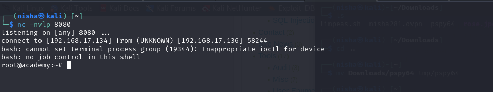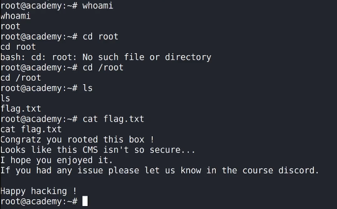 This walkthrough demonstrated a complete penetration testing workflow, from initial enumeration through privilege escalation to ultimately achieving root access. The Academy box provided excellent practice in: