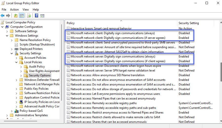 Computer Configuration -> Policies -> Windows Settings -> Security Settings -> Local Policies -> Security Options- Enable “Microsoft network client: Digitally sign communications (always)” and “Microsoft network server: Digitally sign communications (always)”.