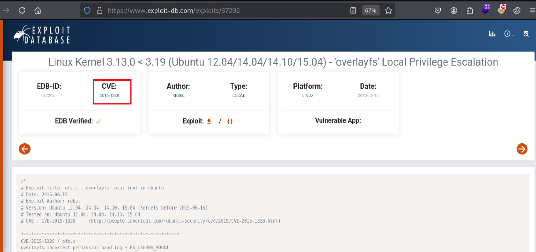 ✅ CVE-2015-1328 Vulnerability Description Vulnerability Name: Linux Kernel 3.13.0 < 3.19 (Ubuntu 12.04/14.04/14.10/15.04) - ‘overlayfs’ Local Privilege Escalation CVE ID: CVE-2015-1328 Exploit Type: Local Privilege Escalation