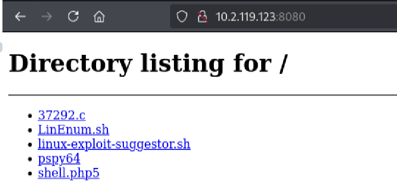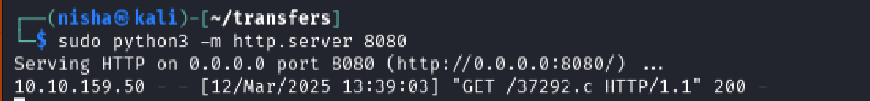 Next, I hosted a Python web server on port 8080 from my Kali VM to serve the exploit to the target machine: