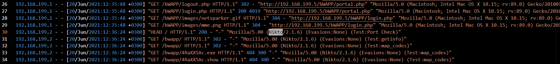 At line 30, I found Nikto in the User-Agent string, confirming that the attacker used Nikto, a popular web vulnerability scanning tool.