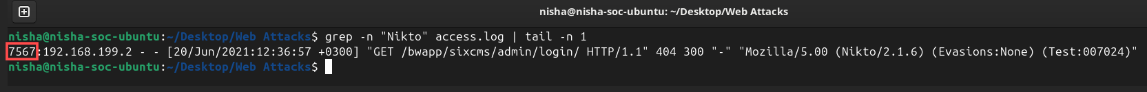 grep -n "Nikto" access.log | tail -n 1